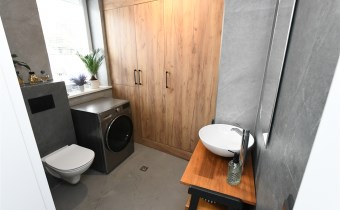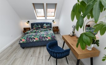 Na piętrze domu znajdziesz sypialnię, dwa dodatkowe pokoje, z których jeden posiada dużą, funkcjonalną garderobę oraz balkon. Duża łazienka na piętrze sprawia, że nawet większa rodzina znajdzie tu swój komfort.
