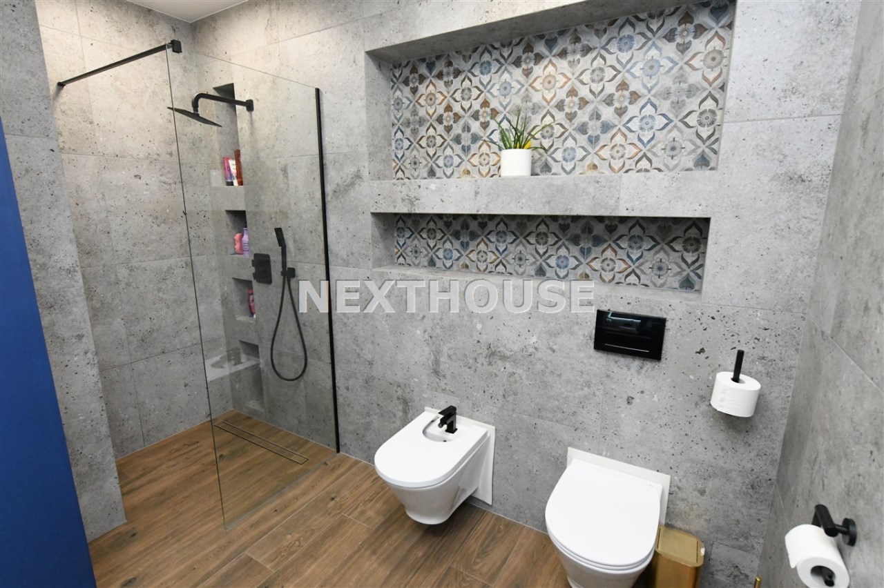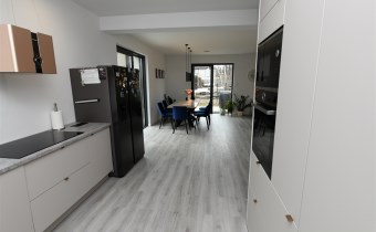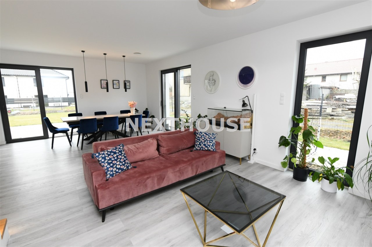Na parterze tego funkcjonalnego,nowoczesnego bliźniaka z 2023 r./elementem wspólnym jest jedynie garaż/ znajdziesz przestronny salon z bezpośrednim wyjściem do ogrodu oraz nowoczesną kuchnię/z osobną spiżarnią/, wyposażoną w sprzęt AGD marki Bosch. Dodatkowo, na parterze znajduje się WC, wiatrołap oraz dwustanowiskowy garaż z automatyczną bramą "Krajewski", a także kotłownia z dwu-funkcyjnym bardzo ekonomicznym kotłem Brotje.