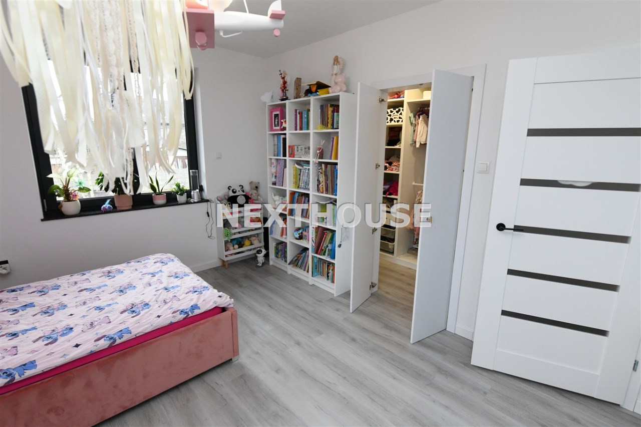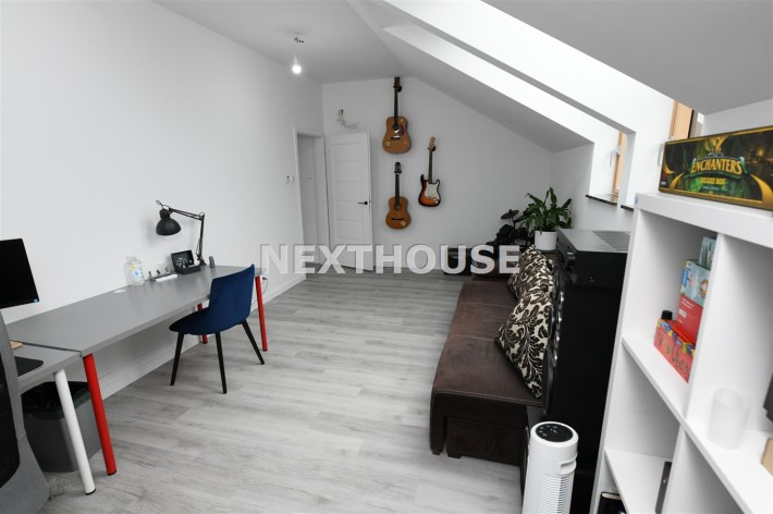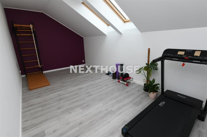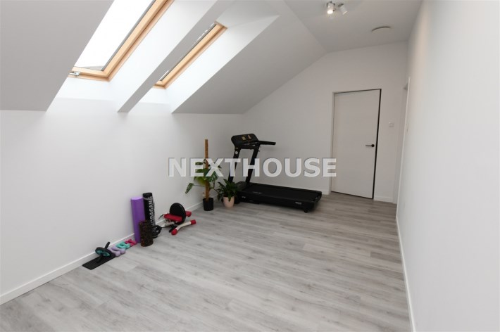 Piętro oferuje trzy komfortowe sypialnie, z czego dwie wyposażone są w praktyczne garderoby. Znajdziesz tu również przestronne,funkcjonalne biuro, siłownię, pralnię oraz wygodną i funkcjonalną dużą łazienkę, dzięki czemu każdy członek rodziny znajdzie swoją przestrzeń. Dodatkowe miejsce do przechowywania oferuje zaś poddasze,idealna przestrzeń na ubrania sezonowe i inne drobiazgi.
