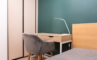 Sypialnia: wydzielona efektowną ścianką działową z przeszkleniem, co nadaje wnętrzu loftowy i nowoczesny charakter. Wyposażona w pojemną szafę w zabudowie.