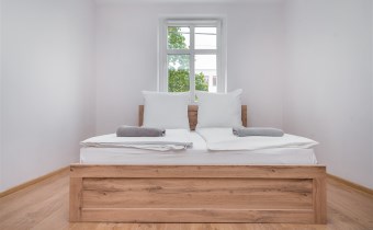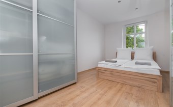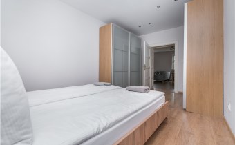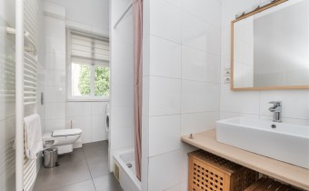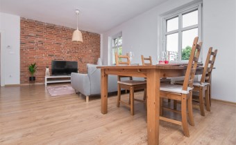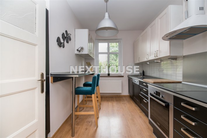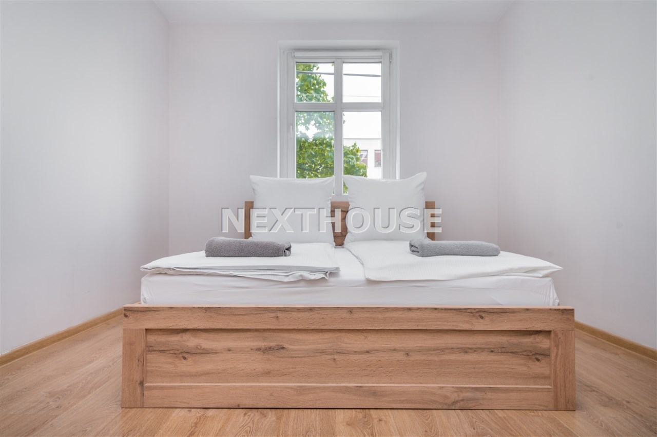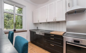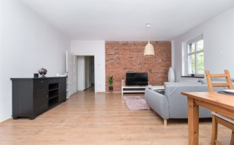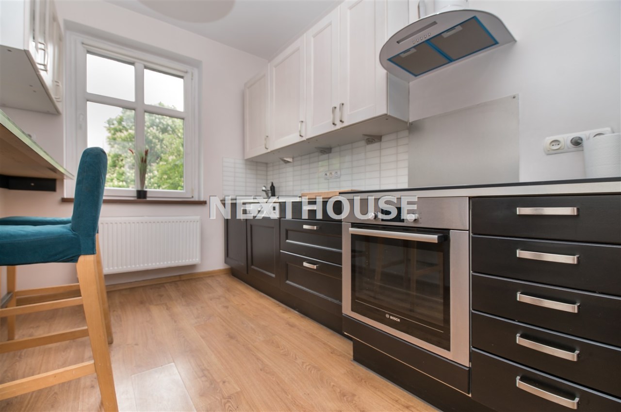2 składa się z dużego pokoju wyposażonego w sofę, witrynkę, komodę, stolik i stół z krzesłami oraz TV, dostęp do internetu. Drugi pokój to sypialnia wyposażona w podwójne łóżko, szafki nocne i 2 duże szafy. Kuchnia w zabudowie wraz ze sprzętem AGD (lodówka, zmywarka, płyta indukcyjna, piekarnik, automat do zaparzania kawy). W łazience umywalka, kabina prysznicowa, wc i pralka oraz kocioł gazowy dwufunkcyjny Firmy Vailant. Na przedpokoju znajduje się duża szafa i górne półki. W budynku domofon, dwa wejścia: jedno od ul. Hutniczej drugie od strony podwórka, gdzie znajdują się miejsca parkingowe.