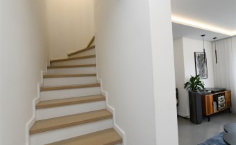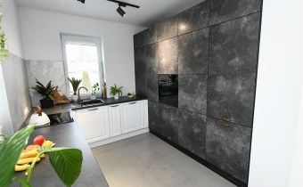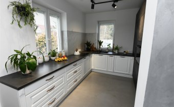 Dom został zbudowany z myślą o komforcie i wygodzie. Na parterze znajduje się przestronny salon z kominkiem, połączony z aneksem kuchennym i wydzieloną kuchnią z pełną zabudową AGD. Bezpośrednie wyjście do zadbanego ogrodu pozwala cieszyć się chwilami na świeżym powietrzu. Na tym poziomie znajduje się także wiatrołap,WC oraz garaż o powierzchni 19,5 m².