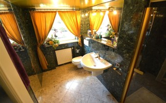 Na parterze znajduje się salon z kominkiem i wyjściem na taras prowadzący do ogrodu, gabinet, łazienka, pralnia, kotłownia oraz pomieszczenie gospodarcze. Duży hall dodaje klasy i przestronności. Piętro to otwarty salon z jadalnią, sypialnia z balkonem, garderoba, kuchnia oraz dodatkowy pokój. Przed domem znajduje się murowany garaż ,który pomieści nawet trzy auta – idealne rozwiązanie dla większej rodziny lub potrzeb firmy.