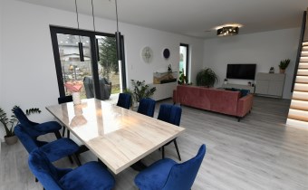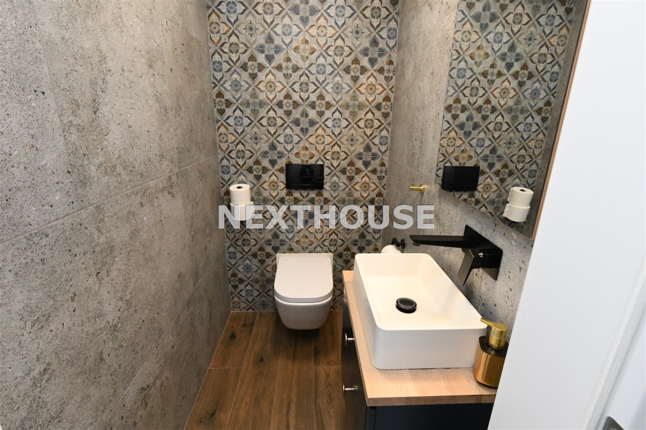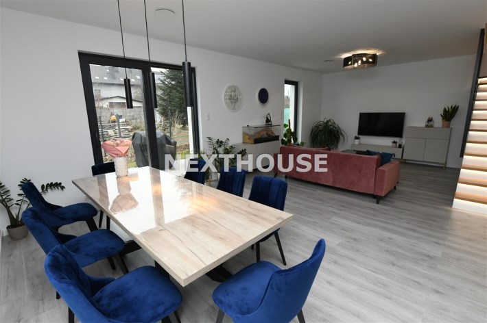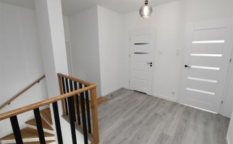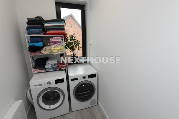 Na parterze tego funkcjonalnego,nowoczesnego bliźniaka z 2023 r./elementem wspólnym jest jedynie garaż/ znajdziesz przestronny salon z bezpośrednim wyjściem do ogrodu oraz nowoczesną kuchnię/z osobną spiżarnią/, wyposażoną w sprzęt AGD marki Bosch. Dodatkowo, na parterze znajduje się WC, wiatrołap oraz dwustanowiskowy garaż z automatyczną bramą "Krajewski", a także kotłownia z dwu-funkcyjnym bardzo ekonomicznym kotłem Brotje.