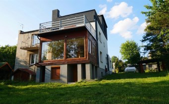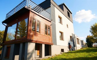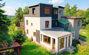 Dom w części głównej składa się z 5 pokoi, kuchni, łazienki, dwóch tarasów zewnętrznych oraz dwóch przeszklonych ogrodów zimowych.