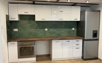 kuchnia w zabudowie z AGD (piekarnik, płyta indukcyjna, lodówka, pralka),