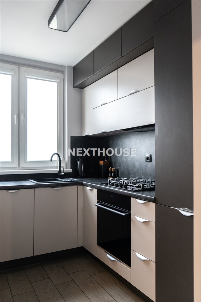 Kuchnia: Pełne wyposażenie AGD w zabudowie (płyta gazowa, piekarnik, lodówka, okap). Estetyczna zabudowa w modnym kontraście kolorystycznym.