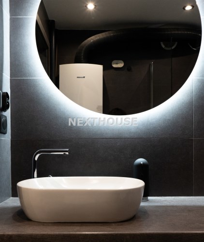 Wnętrze utrzymane jest w nowoczesnej, spójnej kolorystyce (szarości, beże, czerń), co tworzy elegancką i relaksującą przestrzeń: