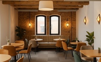 nowoczesną restaurację lub przestrzeń gastronomiczną z antresolą,